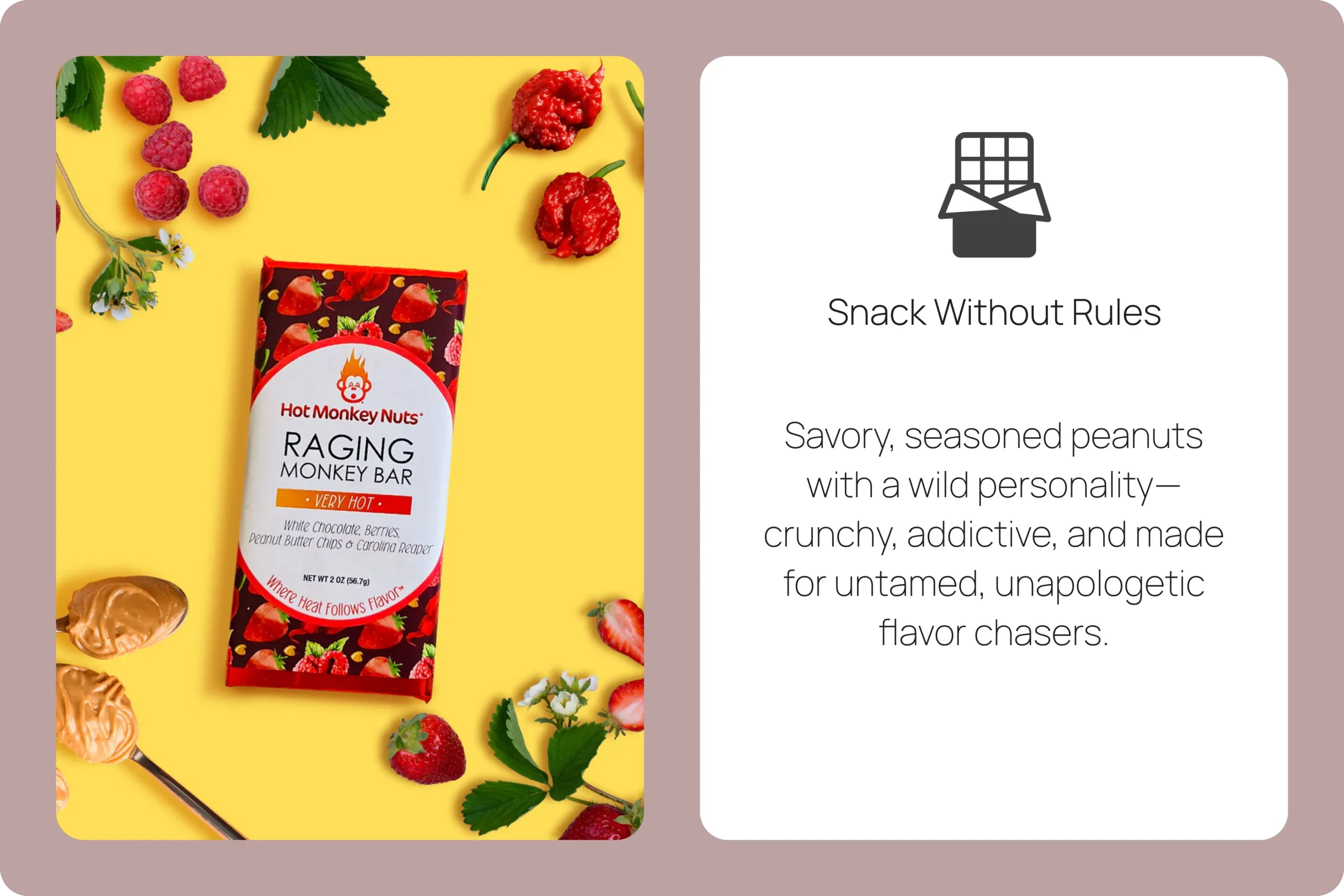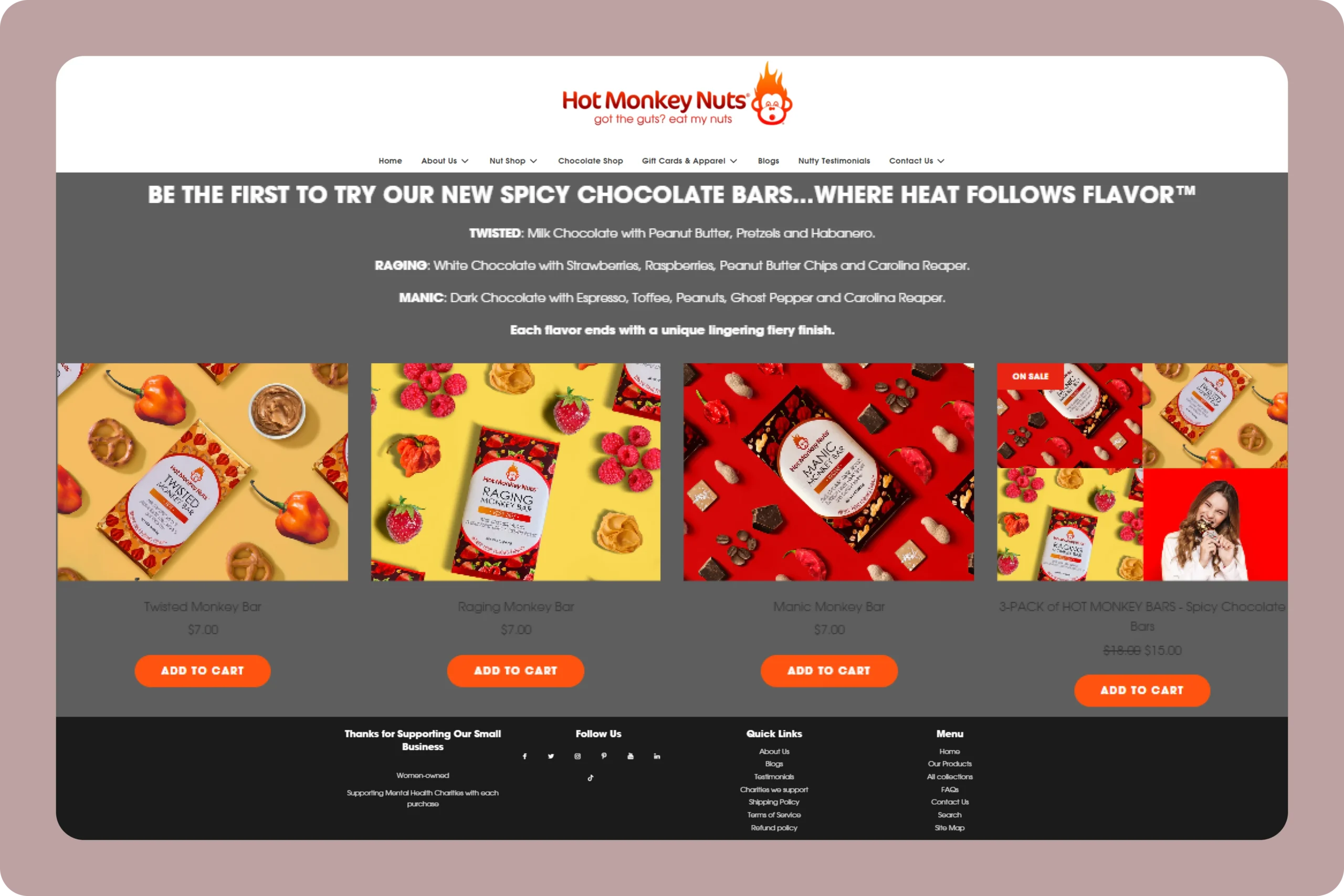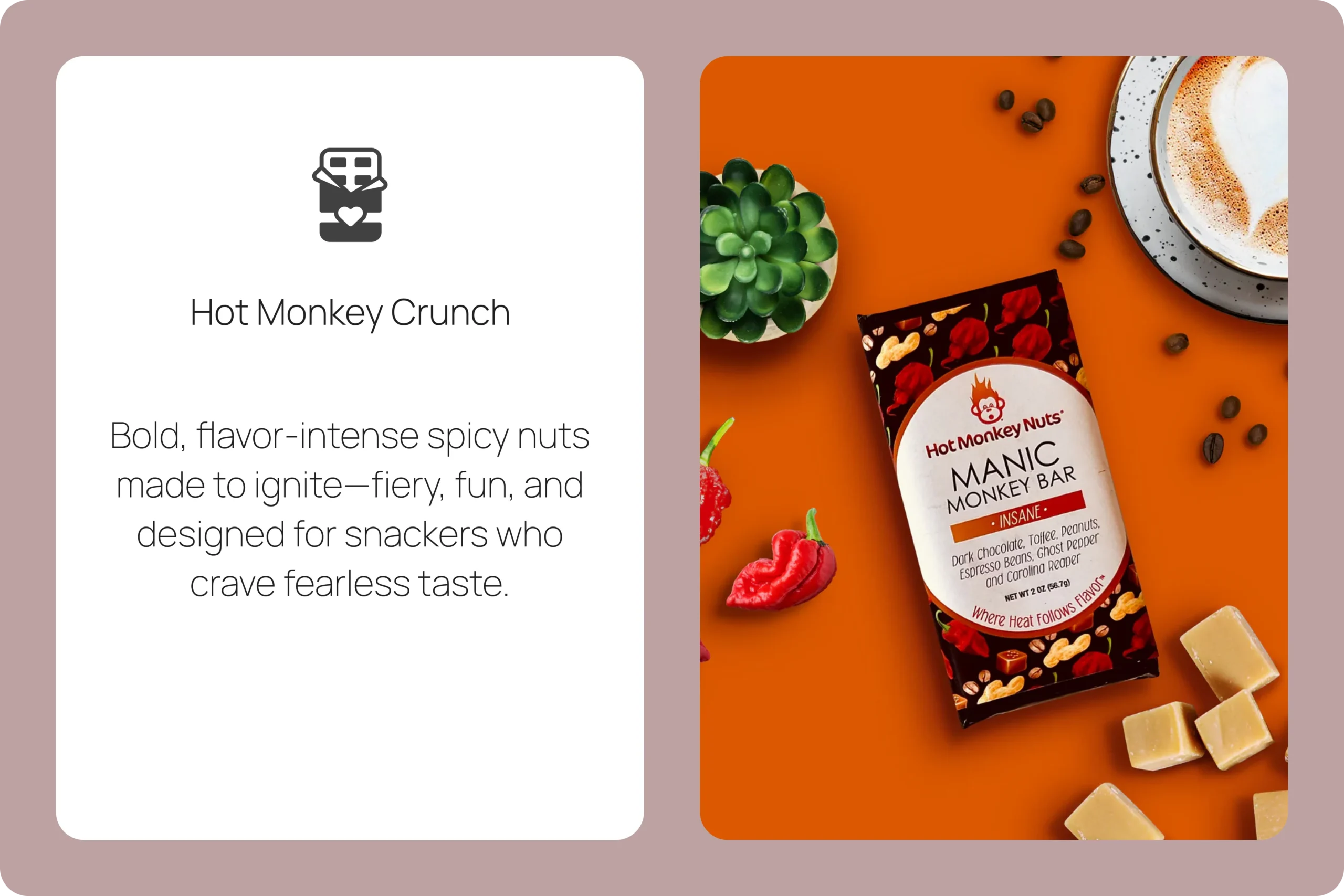 A digital snack with serious kick. For Hot Monkey Nuts, we crafted a Shopify storefront that delivers big flavor and big attitude—capturing the heat-loving spirit of a bold snack brand that doesn’t hold back.